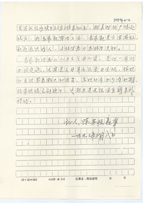 该同志担任村妇女主任多年,工作积极,任劳任怨,不怕得罪人。现年老丧失体力,只好在江津市城关德顺街二十二号帮助别人带小孩,维持生活。爱人武华春已因年老丧失体力。现在江津市检察院守家属房维持生活。