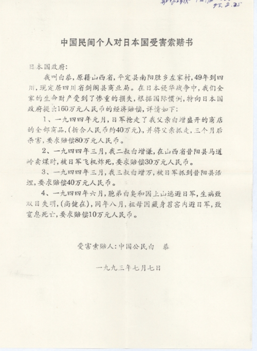 我叫白恭,原籍山西省,平定县南阳胜乡左家村,49年到四川,现定居四川省剑阁县商业局。在日本侵华战争中,我们全家的生命财产受到了惨重的损失,根据国际惯例,特向日本国政府提出160万元人民币的经济赔偿,详情如下: