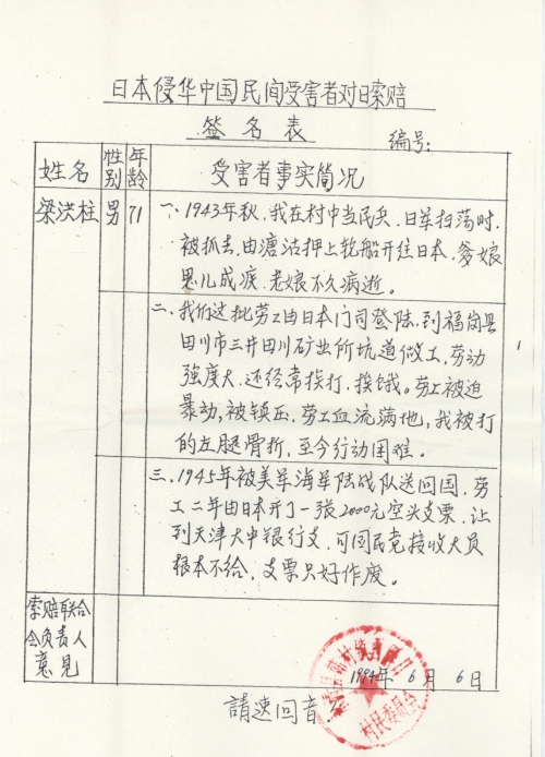 细节:1943年秋天日军来我村扫荡时我被抓上开往日本的轮船,老娘不久病逝。我们这批劳工在日本做苦工,劳动强度非常大还经常挨打挨饿,我被打的至今行动困难。