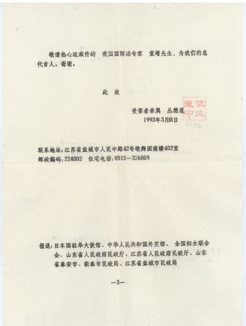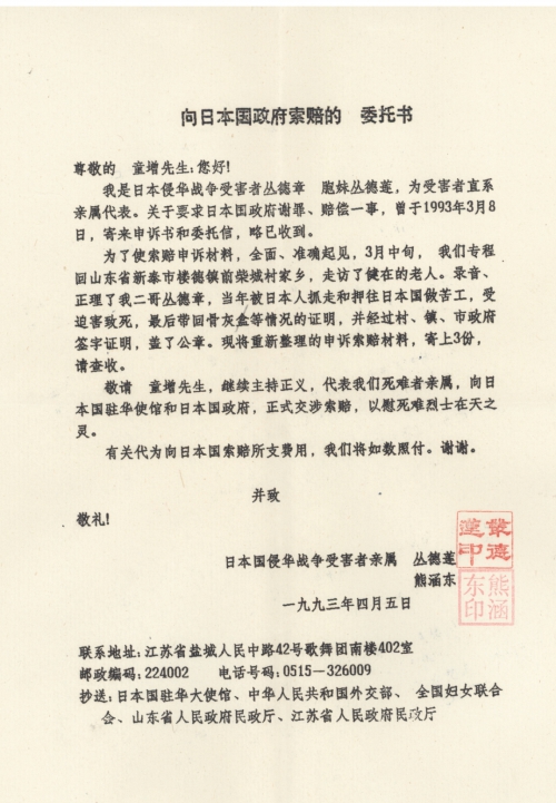 我是日本侵华战争受害者丛德章胞妹丛德莲,为受害者直系亲属代表。关于要求日本国政府谢罪、赔偿一事,曾于1993年3月8日,寄来申诉书和委托信,略已收到。