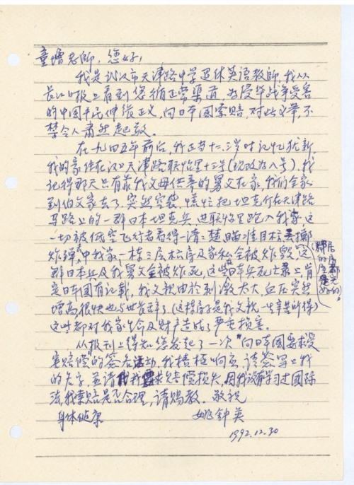 我是武汉市天津路中学退休英语教师,我从长江时报上看到您循正常渠道,为侵华战争受害的中国平民伸张正义,向日本国索赔,对此义举,不禁令人肃然起敬。