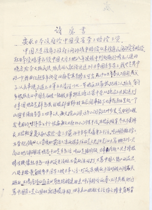 中国只是放弃了政府之间的战争赔偿,从未放弃民间的受害赔偿。在日本侵略军占领中国大片土地八年过程中,到处施行惨无人道的烧杀抢夺大抓民夫,抓去的人就强迫送到日本国去当劳工,我也是其中的一个。我回忆起当年所受的痛苦真是惨不可言。在1942年春天二月间。我父子二人去串亲,正遇上日军在大清河川北一带地区扫荡,就把我二人抓去,有许多被抓去的中国老百姓一起被日军押送塘沽集中营。从塘沽上火轮送到日本国,地名是群马县利根郡月野村,在后[闲]车站下火车往南6里处一个山沟里强迫当劳工四年之久。每天挖山洞。这个山洞长达卅多里,是水利工程发电用的。对待劳工十分狠毒,每天日夜在山洞里干活。不给衣服穿,冬天不发棉衣,不给鞋穿。夏天每人发给一条三寸宽的[兜][裆]布,光着身子干活。吃的稻糠饽饽不管饱。饿的人人骨瘦如柴活活冻死很多。住的是不见阳光的大窝棚,不到一尺高的地铺,潮湿难忍。干的是牛马活,吃的是猪狗饭。日本代班工头手持棍棒皮鞭,像赶牛马一样的没头没脑不管死活的打,大骂中国人统统的混蛋,八格牙路等。有很多中国劳工被日本人活活打死,冻饿死,干活时被山洞石头砸死,不堪虐待的自杀的,有逃跑被逮回来,叫洋狗咬死等等不计其数。他们骂中国劳工是亡国奴,就得喂洋狗,四年来的地狱生活,伤亡惨重,有折背断腿的耳被震聋的占大多数,到1945年底日本投降时活下来人只有100多人,日本投降后我们在驻日美军的帮助下才结束了劳工生活。到46年春将我们护送到祖国的青岛市由红十字会接待和收容了我们。后来分散回家。我的遭遇大致就申诉到此,详情面谈。