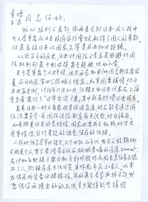 我从报刊上看到你[俩]多次到日本为二战中个人受害者向日本政府进行索赔,取得了国人的尊敬。但是总被日本以国家不答责为由加以拒绝。