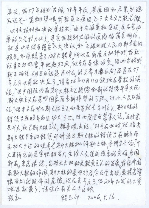 以往报刊和决议曾提出:“由于右派乘机进攻,反右是必要的,只是扩大化了”,其实我被划为右派的原因很简直明白,就是中共没有落实八大决议和正确处理人民内部矛盾的报告和原稿来了180°大转弯。所以在开展反批评时,我就说青天打炸雷,平地起狂风,似乎有点像政变。因此当时我就不相信6月8日这是为什么的文章才反右!而是在57年元月以前就决定了。请看56年11月11日铁托有普拉的演说:“共产国际内有斯大林主义路线和新的路线斗争,又说斯大林主义在某些国家有重新得势的可能”对此,人民日报说:“根本不存什么斯大林主义,如果有就是马列主义,斯大林的错误只在晚年,而且功大于过”。对此,陶里亚蒂等人说:“反对苏共二十大,就是斯大林主义”。赫鲁晓夫说:“列宁在世时,就指出斯大林严重的错误,那种认为斯大林的错误只在晚年而且功大于过的观点是斯大林批评斯大林,哥穆尔卡说:“个人崇拜它的危害性相当大,会给人民造成深重的灾难,各国都有”,米高扬说:“它将大大地助长教条主义的发展”。我说中国有斯大林的作风,斯大林的某些行为,今后会出现,要提高警惕,否则就致命的危险。现在虽平反了,但20年扣发的工资难道就算了!请你向有关人士反映。