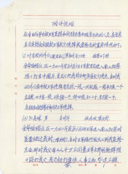 细节:1942年金华县被日军占领,金华沦陷,人民遭殃。寄来一份在日军侵略战争中被日军直接或者间接杀害和迫害而死的人员、房屋、家具、农具、粮食、衣服等被日军放火烧掉或者抢去的真实情况表。