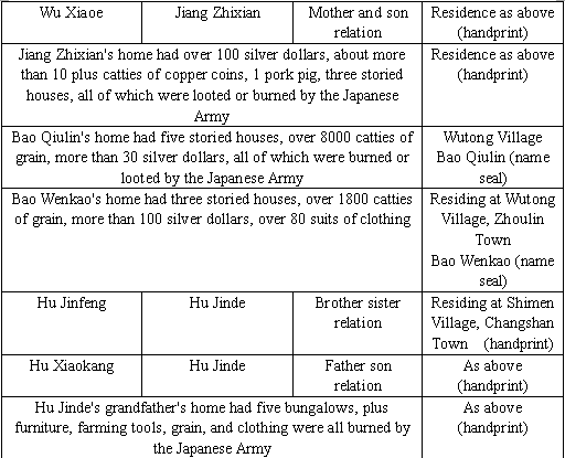 The following is a true account of individuals who were directly or indirectly killed, or persecuted by the Japanese Army, along with houses, furniture, farming tools, grain, and clothing burned or looted by the Japanese Army during the Sino-Japanese war: