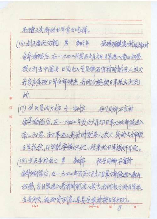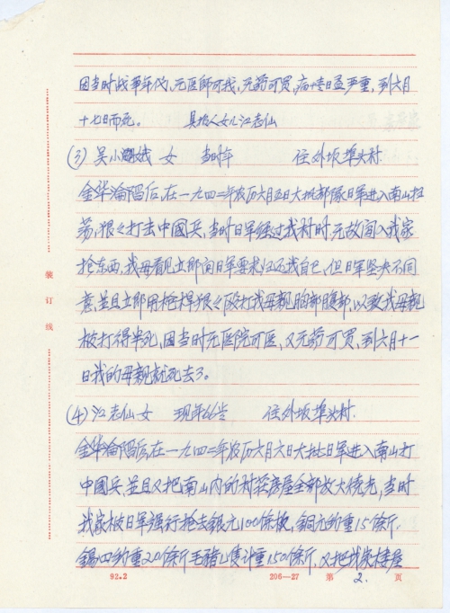 Other details:In 1942, Jinhua County was occupied by the Japanese army, leaving its people at the enemy’s mercy. I hereby send a fact sheet which contains the information on victims killed or persecuted to death directly or indirectly by the Japanese troops, as well as houses, furniture, farm tools, food, clothes and other items burned or looted by them.