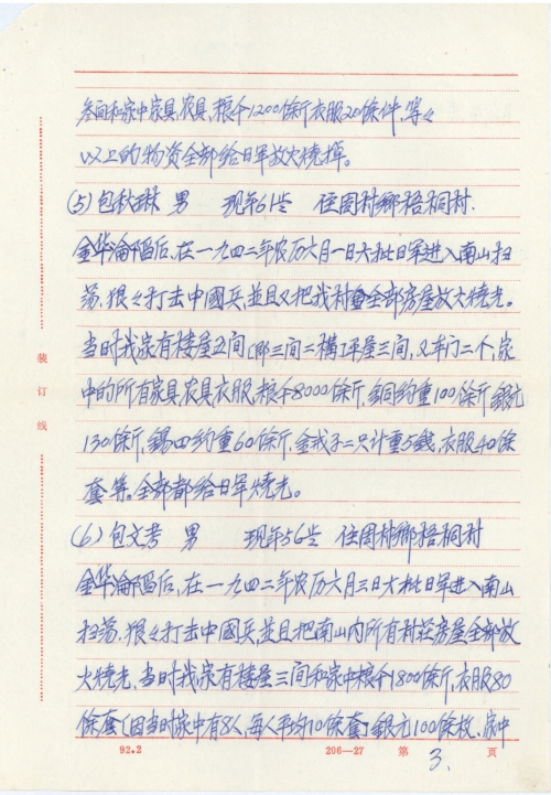 After Jinhua fell into the hands of the enemy, on June 6, 1942 lunar calendar, massive Japanese troops entered the South Mountain to attack Chinese troops, and also set fire to all village houses inside the South Mountain, back then my home was looted by the Japanese Army, they looted over 100 silver dollars, which weighed over 15 catties, pewter ware weighing over 20 catties, one pork pig weighing over 150 catties, and the Japanese Army also burned three storied houses along with all furniture, farming tools, over 1200 catties of grain about, more than 20 pieces of clothing etc.