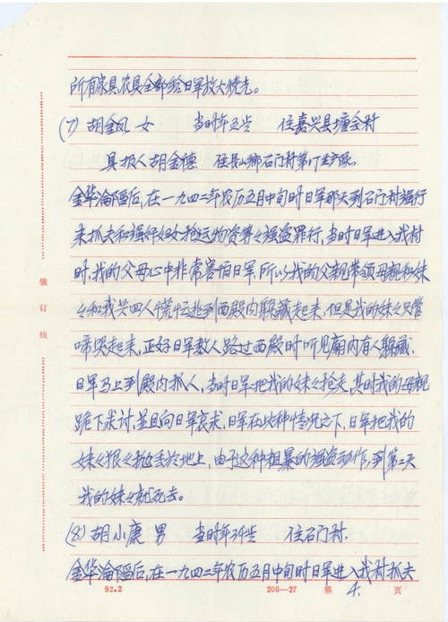 After Jinhua fell into the hands of the enemy, in mid May 1942 lunar calendar, the Japanese Army came to Shimen Village to capture conscript, rape women and transport materials like bandits. At that time when the Japanese Army entered our village, my parents feared the Japanese Army very much, so my father led mother and younger sister and myself totaling four persons hurriedly fled to the west hall to hide ourselves, but my younger sister began to cry, at that time several Japanese soldiers passed the west hall and heard the noise in hiding, the Japanese soldiers immediately went to the west hall to make arrests. The Japanese soldiers took away my younger sister, at that time my mother knelt down to beg mercy, and pleaded the Japanese soldiers. Under such circumstances, the Japanese soldiers threw my younger sister forcefully onto the ground, because of such barbaric robber behavior, my younger sister died from the injury on the second day.