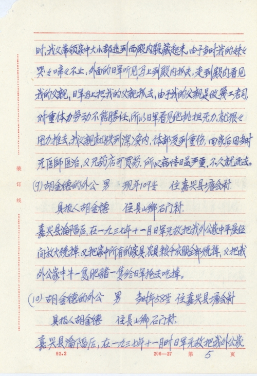 (10) Grandfather of Hu Jinde Male aged then at 58 Residing at Tanghui Village, Jiaxing County