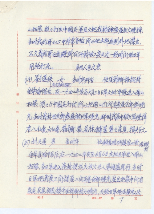 (14) Liu Lianmei (mother of Bao Wenkao)   Female aged then at 34 Residing at Wutong Village, Zhoucun Town