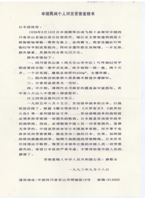 中国民间个人对日受害索赔书