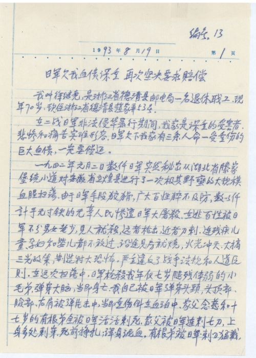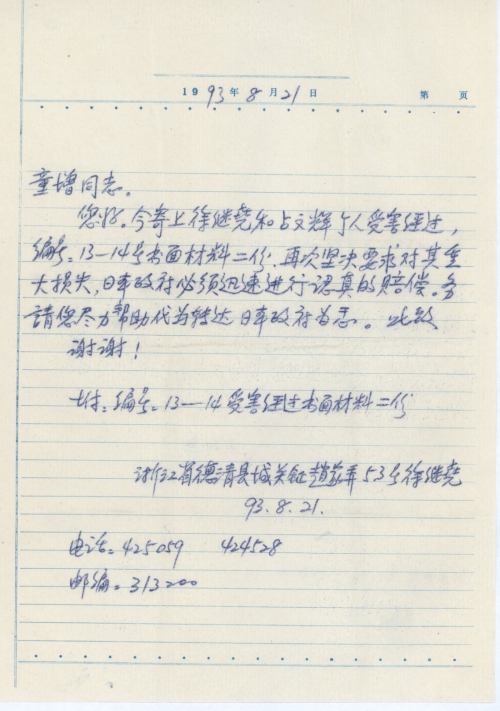 I hereby, enclosed in this mail the individual persecution processes of Xu Jiyao and Zhan Wenhui,, two written materials of S/N: No. 13-14, once again I resolutely demand the Japanese government to make rapid and earnest compensation for the heavy losses. Make sure try your best to facilitate forwarding these documents to the Japanese government, for which I feel immensely grateful.