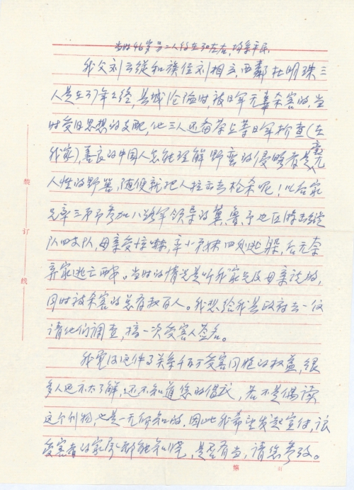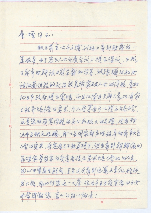 数日前在“大千文摘”刊物上看到转载的一篇报导,由于您在人大代表会议上提出倡议,在抗日战争时期被日寇杀戮和伤害、被蹂躏的妇女、被细菌试验致死及被轰炸家破人亡的同胞,有权向日本政府提出索赔,而且江泽民主席已表明国家已放弃赔偿的要求,个人受害者可以提出赔偿,这是您对受害同胞的关心和极大的支持。过去对这件事缺乏明了,我以为国家都声明放弃对战争赔偿的要求,受害者已不能再提了,但当看到朝鲜(南、北)、菲律宾等国家的受害者提出要求赔偿的时候,我心中曾发生疑问,直至这次看到这篇文章后,始恍然大悟,因此对您这一义举,作为千百万受害者的子女非常感激您,衷心的致以谢意!
