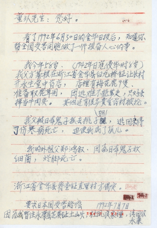 看了1992年6月30日的金华日报后,知道你帮全国受害同胞做了一件振奋人心的事。