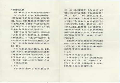 今天日本国株式会社日清公司仍然存在,而且一跃成为世界第一经济大国,我们是陈明运的亲生儿女完全有权要求日本政府按照有关国际法律和日本国日清公司正式职工劳动保护条例条款进行落实、支持我们完全合理地索赔,这样做才是真正体现了中日两国人民世世代代有着渊源历史的友谊!