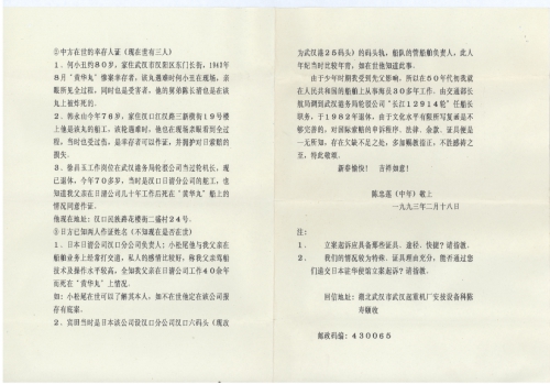 由于少年时期我受到先父影响,所以在50年代初我就在人民共和国的船舶上从事海员30多年工作。由交通部长航局调到武汉港务局轮驳公司“长江12914轮”任船长职务,于1982年退休,由于文化水平有限所写复函是不够完善的,对国际索赔的申诉程序、法律、余款、证[据]便是一无所知,存在欠缺不足之处,多加赐教指正,不胜感祷之至,特此敬颂。