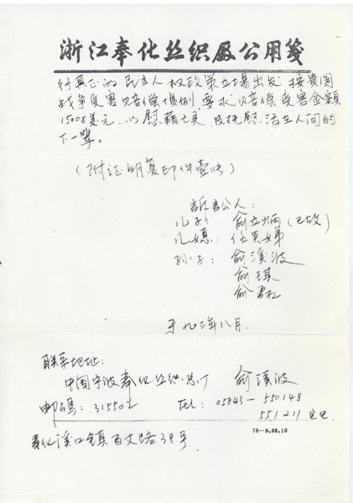 兹有我曾祖父,姓俞名邦田,生于一九○四年,职业木匠,新昌沙溪甘坑人。因生活贫困于一九四一年七月赴宁波市郊打工,遇上日本军被抓,终未回家。究竟是当劳工,还是被做化学武器试验,还是因中途潜逃被枪杀,或许是被当作人肉被吃掉……至今下落不明。