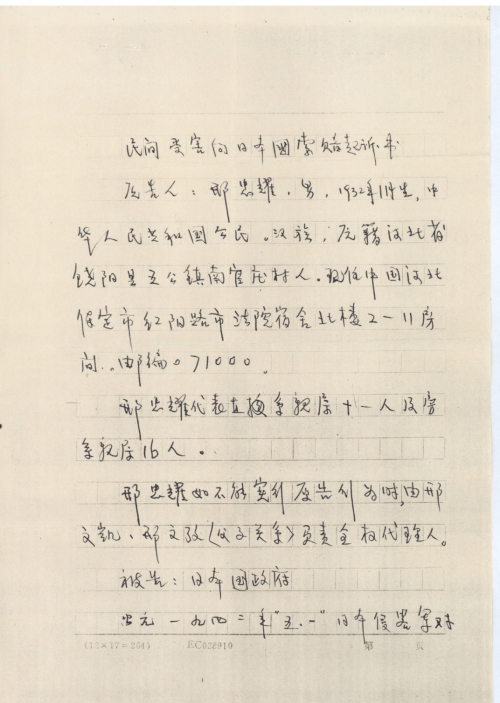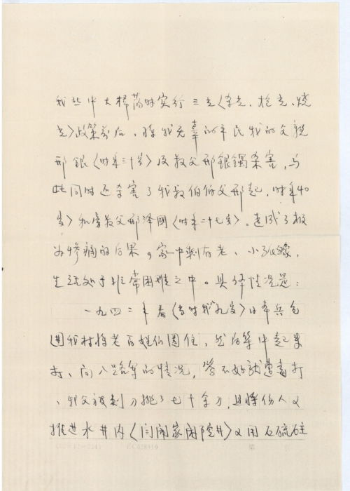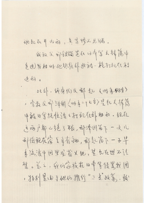 此外,我旁伯父刑起(时年48岁),旁叔父邢泽国(时年二十七岁)是在大扫荡中被日军捉住活活打死在外村的。现在这两户都已绝了根,邢泽国留下一女儿邢俭现在家长年有病,邢起留下一子早年流浪中国黑龙省×地,是否在世不清楚。总之,我们家族在日本军侵略我国,特别是由于他们推行“三光”政策,致使我们遭受了极为深重的灾难,给留下来的后人亲友们精神上、经济上的损失都是无法估量的。
