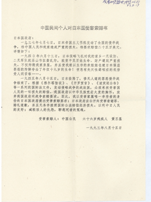 一九四五年八月十五日,日本投降了,惨无人道的罪恶侵华战争结束了。根据《雅尔塔协议》、《开罗宣言》、《波茨坦公告》等一系列的国际法文件,发动侵略战争的战败国,必须承担受害国人民的一切损失的赔偿。我国政府以中华民族宽宏大度的胸怀,放弃两国政府间战争索赔要求。因此,我以受害家属唯一幸存者的身份向日本国政府提出受害索赔要求;日本政府应公开向受害者谢罪、赔礼道歉,并且无条件按照国际公法赔偿经济损失。以利中日人民的友好;减轻活人的仇怨,聊慰死者的冤魂。
