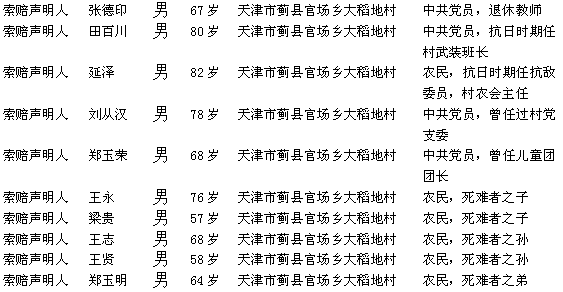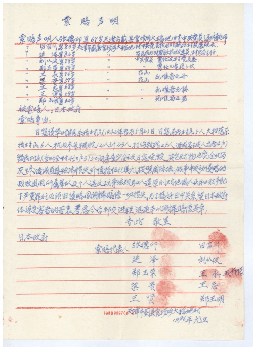 日寇侵华时期,杀我村民(1942年农历5月21日,日寇杀我村民5人,大扫荡杀我村民6人,抗日参军牺牲12人,计23人。打伤致残25人,造成家破人亡者4户),毁我村庄(当时全村450户,3150间房屋完全被日寇烧毁。其它财物也完全化为灰烬),造成直接经济损失价值拾伍亿美元。按照国际法:战争中发动侵略的战败国因所属军队及个人违反战争法规和人道原则,对他国人民和财产犯下严重罪行,必须由侵略国谢罪赔偿一切损失。为了搞好中日关系,望日本政府体谅受害者的苦衷,考虑今后邦交进城,迅速予以谢罪赔偿是幸!