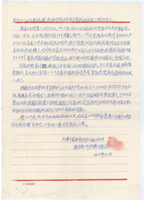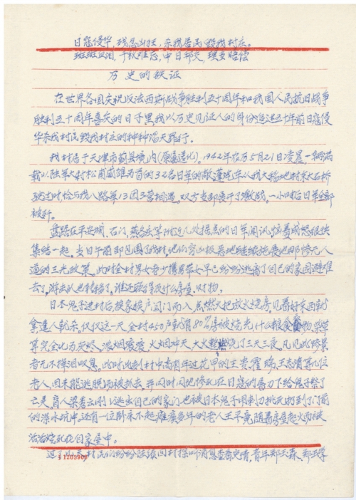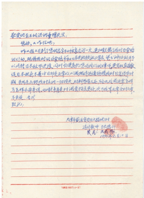 昨从报上见到您的名字和独家专访一文,更加鼓舞了我对日索赔的行动。现将我村向日“索赔书”和《历史的铁证》寄去,望分神协助,并予以代转日本驻华使馆。同时顺便委托您为我们的律师。更有权直接敦促日本政府本着中日邦交正常化,以诚相待,迅速赔偿我村日寇侵华时期,杀我居民,毁我村庄的一切损失。材料恐有不妥,不全之处或还需怎样写怎样办,希来信。如能亲身来村调查指点更好。此乃我等之幸,全村之幸。不多谈,专此。