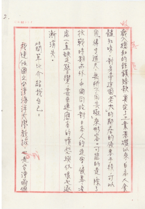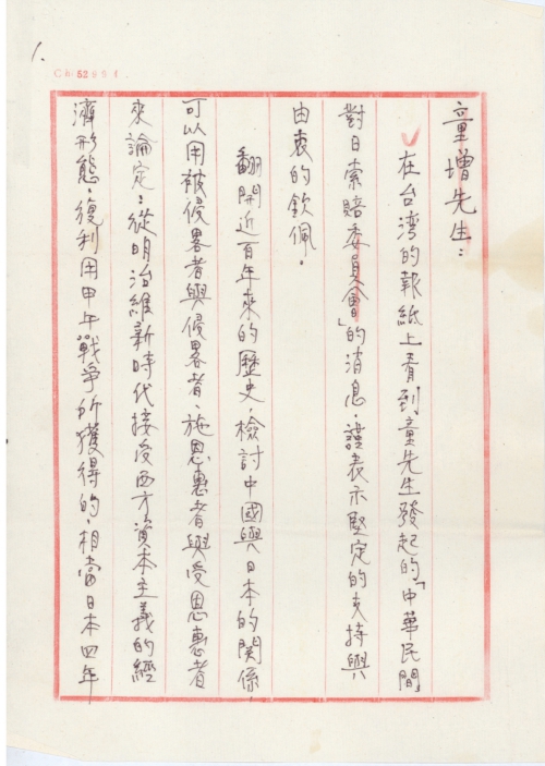 细节:在台湾的报纸上看到童先生发起的“中华民间对日索赔委员会”的消息表示支持和钦佩。日本制造“南京大屠杀”而且还篡改教科书这些种种罪行应该赔偿受害者,我愿意带领学生进行签名活动,支持索赔。