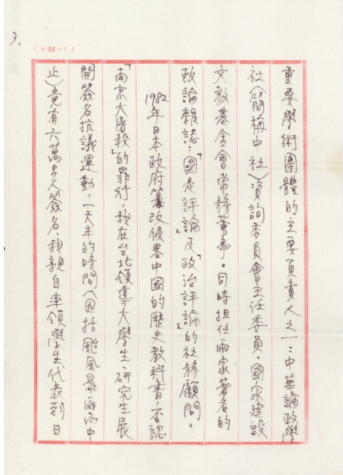 1982年日本政府篡改侵略中国的历史教科书,否认「南京大屠杀」的罪行,我在台北领导大学生、研究生展开签名抗议运动,一天半的时间(因括台风暴雨而中止),竟有六万多人签名,我亲自率领学生代表到日本驻台外交单位——日本交流协会送交抗议书,并当面向日本政府代表宣读我所撰写的抗议书宣言。美国UP.AP.通讯社、香港亚洲周刊(ASIA WEEKS)、日本传媒及台湾各大报、电视台皆争相报导。
