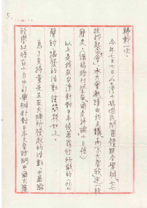 以上是我在台湾针对日本侵华罪行所做的一些声讨、揭发的活动,谨简报如上。