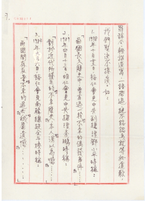 3.1984年九月六日,裕仁会见南韩总统金斗焕时称:「两国间存在着『不幸的过去』,『诚属遗憾』……」