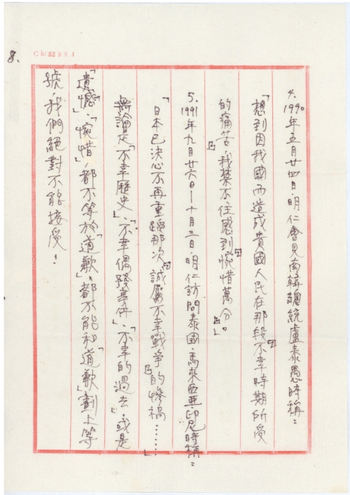 4.1990年五月二十四日,明仁会见南韩总统卢泰愚时称:「想到因我国而造成贵国人民在那段『不幸时期所受的痛苦』,我禁不住感到惋惜万分。”