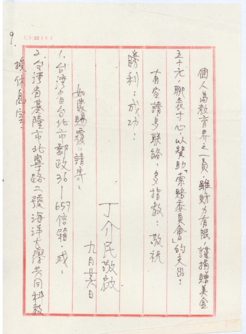 个人为教育界之一员,虽财力有限,谨捐赠美金五十元,聊表寸心,以赞助「索赔委员会」的支出。