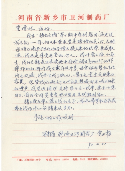 我在“读者文摘”第十期中看到题为“历史没有忘记——国人向日本要求受害赔偿纪实”后,感到您将已隔半个世纪的事情又提出来的[壮]举,甚感敬佩。我也是深受迫害的一个人,我叫党玉梅,42年生,我的父亲是日本侵略中国时,被日飞机[扔]下的炸弹炸死的。那时我父亲年仅二十岁,母亲被形势和生活所迫改嫁,我终生成了孤儿,一辈子无尝过父母亲的慈爱,您替我们喊出了几十年来想喊而未喊出来的呼声,我坚决拥护、支持您的这一[壮]举,愿在以您为主,团结全国受害者共同努力,直到胜利为止。