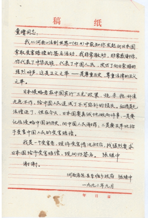 我从河南《法制世界》(92.9)中获知你发起向日本国索取受害赔偿的签名活动,我非常激动,非常感谢你。你代表了中华民族,代表了中国人民,发出了向日索赔的强烈呼声,这是正义之举——是尊重历史,尊重法律的正义之举。