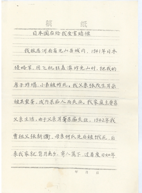 我故居河南省光山县城内,1941年日本侵略军用飞机狂轰滥炸光山时,把我的房子炸塌,小弟被炸死。我父亲张茂生耳朵被其震聋,成为呆痴人而失业。我家庭主要靠父亲生活,由于父亲耳聋呆痴失业,1942年我曾祖父张新衢、母亲何氏先后被饿死,后来我家就背井离乡,寄人篱下,过着度日如年的家破人亡的悲惨生活。