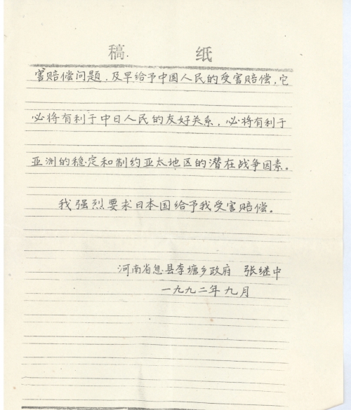 我是一个受害者,现将受害情况附后,我强烈要求日本国给予受害赔偿,现向你签名。张继中