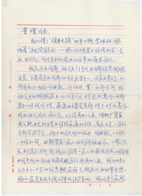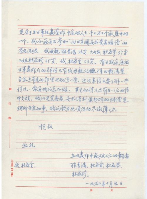 我家居住成都,祖父在三十年代在成都经营绸缎生意,主要商号在成都的闹市渔盐市口。住家在东大街,从我有记忆开始听母亲,外祖母,舅舅和邻里讲。我祖父开的绸缎庄在一九三九年四月日本飞机轰炸成都盐市口时被炸毁,家庭的主要资产都毁于日本的轰炸。我的祖父因此一病不起,不久便离开了人世。因缺少资金我父亲也无力经营和维持家庭的生活,离家出走,一直到今都音信沓无,抛下双目失明的祖母,我母亲、二个姐姐一个妹和我。母亲带着一家人回到外祖母家,以帮人洗衣刺绣等活计,勉强能维持一家人的最低生活。因贫困双目失明的祖父生病无钱医治而离开人世。我的妹妹大约在3-4岁时因患牙齿疾病无钱医治而幼年早逝。我们一家是在死亡线上挣扎活过来的。我们这个家就是属于在日军狂轰滥炸中家破人亡千千万个家庭中的一个。我们一家要求参加“向日本国要求受害赔偿”的签名活动。我母亲张素清76岁。大姐杜应芬57岁二姐杜应珍55岁,我,杜应全53岁。有关我家庭被日军轰炸后的详情只有我母亲记得比较清楚。当然还有老的邻里也知道一些。这次来信主要了解一些情况,需要我们怎么做?其他的情况只有在以后的信中交谈。我们是受害者,要求得到最起码的赔偿是理所当然的事。我们愿为此项活动尽微薄之力。