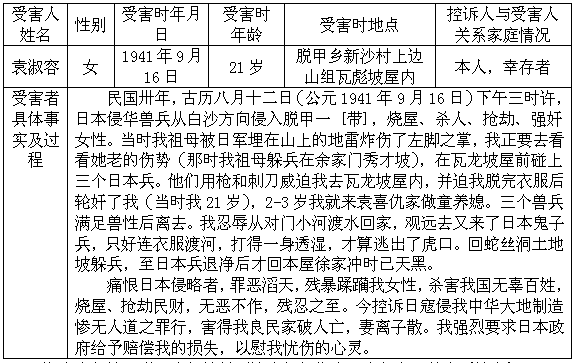徐家冲袁淑容(娘家姓李)2-3岁就在袁喜仇家当童养媳。公元一九四一年九月中旬,日本侵略军从福临铺白沙方向往我脱甲地区进军并与国民党中央军打了一仗,以后就在我地打闹,烧屋杀人,强奸民女。袁三娘和袁七娘躲在秀才坡,在回来看母猪时,被日军埋在山上的地雷炸伤了左脚、脚掌。袁淑容为去看祖母脚伤,走在蛇丝洞附近,碰上三个日本兽兵,就被他们用枪威逼赶到瓦龙坡屋里强迫她脱光衣裤,被三个兽兵进行残暴轮奸,其中还有赵贵阿婆也被另一伙日本兽兵强奸(现已死十多年)。日本鬼子侵略中国,残害我无辜百姓,实属罪恶滔天。对袁淑容的残暴兽行更为突出,一定要求日本政府给予赔偿损失。