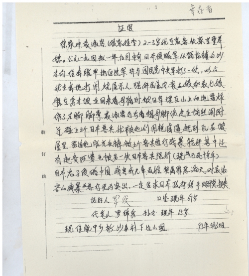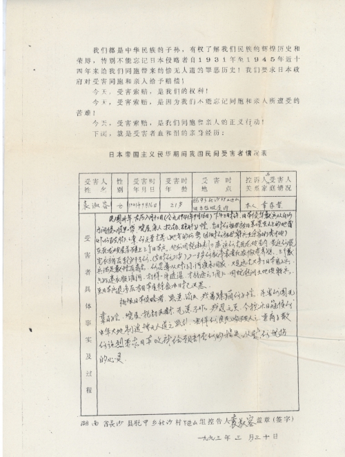 我记得民国卅年古历八月十二日,日本兵从湘阳白沙管沙场向我脱甲方向进兵,与国民党中央军杨森部队打了一仗,后来日军就在我地烧屋、抢劫、杀人、强奸妇女。袁三娘她和袁七娘她躲兵在秀才坡时,想回齐家冲看看家里的猪婆,被日本兵埋设在茶社坡岭上的地雷炸伤了左脚的脚掌,后烂得看见骨头。孙媳袁淑容因看祖母脚伤,被途中劈面的日本兽兵(三个)强迫用枪和刺刀挡住并被迫进瓦龙坡屋内脱光衣服进行强奸,三个日本兽兵轮流残暴并发泄了兽性后才离去。袁淑容受尽曲辱后才惊慌从对门小河内渡返齐家冲,一身透湿,这些惨景,年青女性怕羞,当然不好公开讲出,现向日本政府控诉日军罪行,并要求赔偿。我就证实这些。