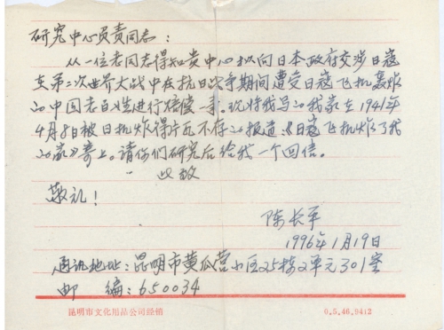 从一位老同志得知贵中心拟向日本政府交涉日寇在第二次世界大战中在抗日战争期间遭受日寇飞机轰炸的中国老百姓进行赔偿一事。现将我写的我家在1941年4月8日被日机炸得片瓦不存的报道:《日寇飞机炸了我的家》寄上。请你们研究后给我一个回音。
