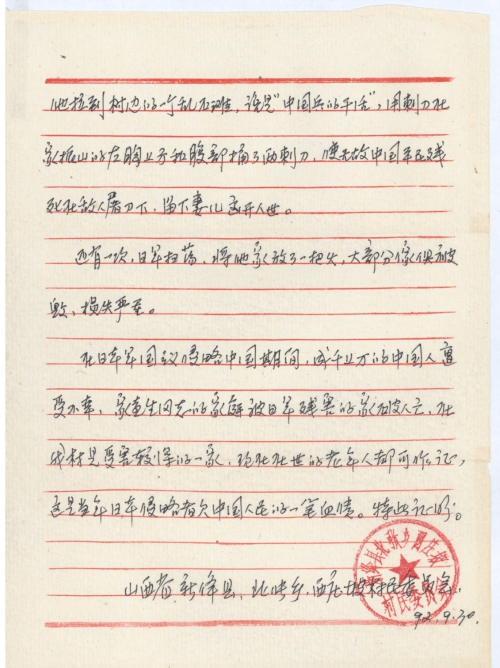 This is to certify that comrade Jia Xisheng (head of the Organization Department of Houma Pingyang State-Owned Machinery Factory under China Shipbuilding Industry Corporation)’s father Jia Zhenshan from Xizhuangpo wa.s killed by the invading Japanese army on February 23, 1943