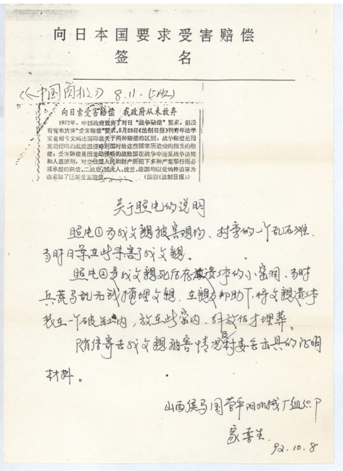 I sent you my signature form of demanding compensation against Japan in this June and got your help. I’ve recently obtained evidence materials about my father’s victimization and I am now sending the materials to you. Let me know in the reply letter if there’s anything I can do.