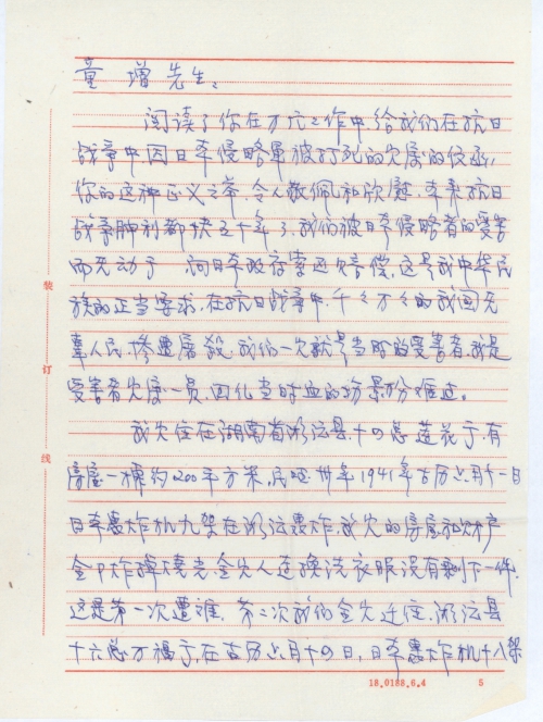After reading your letter to family members of victims killed by the invading Japanese army during its war of aggression against China, I’m filled with admiration and respect for your righteous act. Although it’s been nearly 50 years since the victory of the war, nothing has been done to comfort victims of Japanese invaders. Demanding compensation from the Japanese government is a righteous request of the Chinese nation. In the war aggression, millions of innocent Chinese people were tragically massacred. My family were also victims, including me. Recalling painful scenes makes me sad.