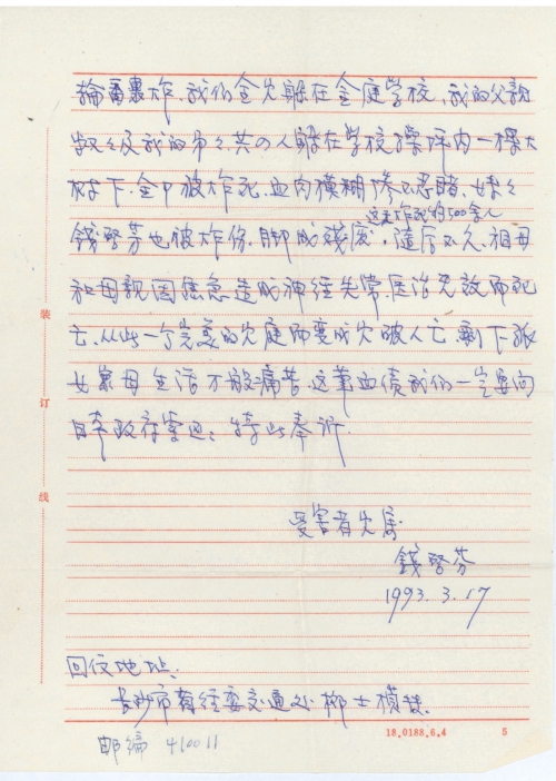 My family lived in Lianhua Street, Shisizong, Xiangtan County, Hunan Province and had a house of about 200 square meters. On lunar June 11, 1941, the 30th year of the Republic of China, 9 Japanese planes bombed Xiangtan, burning down my family’s house and all property in it. All my family even had no clothes to change. This was the first time we suffered. Then, my whole family moved to Wanfu Street, Shiliuzong, Xiangtan County. On lunar June 14, 18 Japanese planes bombed Xiangtan. My whole family hid in Jinting School. 4 of my family members including my father, uncle and younger brother who were hiding under a big tree on the school’s playground were killed by a bomb. Their bodies were badly mutilated. It was appalling. My younger sister Qian Qifen was injured in the bombing and later became disabled in the foot. On that day alone, about 500 people were bombed to death. Not long after that, my grandmother and mother suffered from mental disorders due to anxiety and died despite treatment. My perfect family was thus torn apart. Only orphans and widows are left to live a painful life. We must demand the Japanese government to repay the debt of blood. Above is my claim.