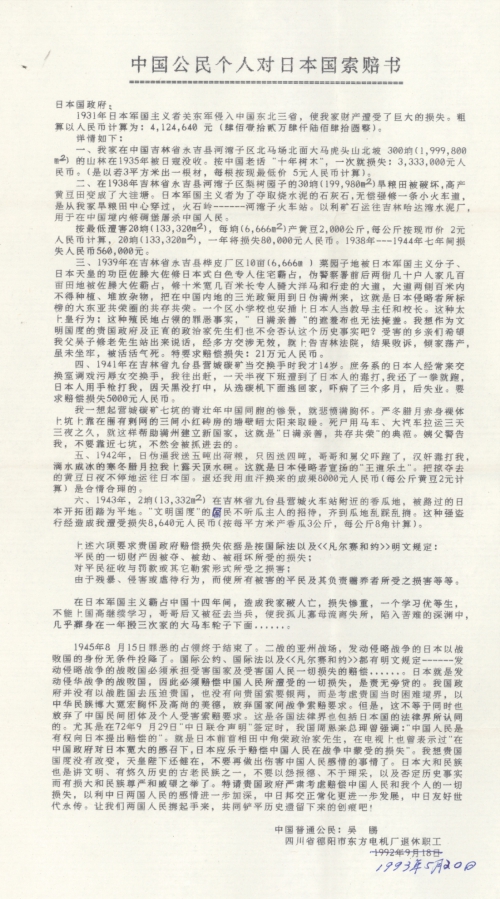 1945年8月15日,罪恶的占领终于结束了。二战的亚洲战场,发动侵略战争的日本以战败国的身份无条件投降了。国际公约、国际法以及《凡尔赛和约》都有明文规定——发动侵略战争的战败国必须承担受害国家及受害国人民一切损失的赔偿……。日本就是发动侵华战争的战败国,因此必须赔偿中国人民所遭受的一切损失,是责无旁贷的。我国政府并没有以战胜国去压迫贵国,也没有向贵国索要银两,而是考虑贵国当时困难境界,以中华民族博大宽宏胸怀及高尚的美德,放弃国家间战争索赔要求。但是,这不等于同时也放弃了中国民间团体及个人受害索赔要求。这是各国法律界也包括日本国的法律界所认同的。尤其是在72年9月29日“中日联合声明”签[订]时,我国周恩来总理曾强调:“中国人民是有权向日本提出赔偿的”。就是日本前首相田中角荣政治家先生,在电视上也曾表示过“在中国政府对日本宽大的感召下,日本应乐于赔偿中国人民在战争中蒙受的损失”。我想贵国国度没有改变,天皇陛下还健在,不要再做出伤害中国人民感情的事情了。日本大和民族也是讲文明、有悠久历史的古老民族之一,不要以德报怨、不[予]理睬,以及否定历史事实而有损大和民族尊严和威望之举了。特请贵国政府严肃考虑赔偿中国人民和我个人的一切损失,以利中日两国人民的感情进一步加深,中日邦交正常化更进一步发展,中日友好世代永传。让我们两国人民携起手来,共同铲平历史遗留下来的创痕吧!