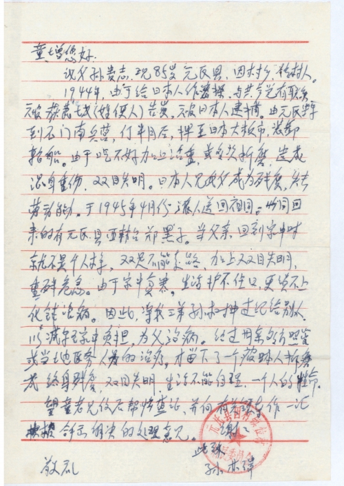 1994年,由于给日本人作密探,与共产党有联系。被获菎坟(姓便人)告密,被日本人逮捕。由元氏坐车到石门南兵营,停半月后,押至日本大[阪]市,装卸轮船。由于吃不好,加上活重,或多次折磨,造成[浑]身重伤,双目失明。日本人见我父成为残疾,失去劳动能力,于1945年4月份派人送回祖国。一同回来的有元氏县西韩台郑黑子。当父亲回到家中时就不是个人样,双足不能走路,加上双目失明,重病危急。由于家中贫寒,生活护不住口,更谈不上[花]钱治病。因此,将我三弟孙树申过[继]给别人,以减轻家中负担,为父治病。经过母亲多方照管或当地医务人员的治疗,才留下了一个被日本人折磨成终身残疾,双目失明,生活不能自理一个人的性命。