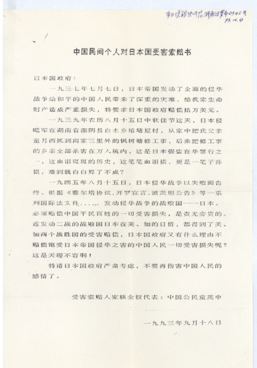 一九三七年七月七日,日本帝国发动了全面的侵华战争给和平的中国人民带来了深重的灾难,给我家生命财产造成严重损失,特要求日本国政府赔偿拾万美元。