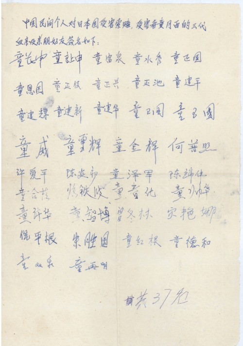 中国民间个人对日本国受害索赔,受害者童月西的三代血亲及亲朋好友签名如下: