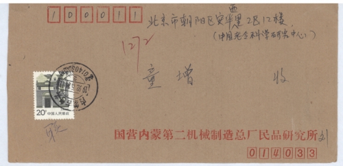 单位:内蒙古第二机械制造总厂 通讯地址:内蒙包头市三号信箱四十一分箱