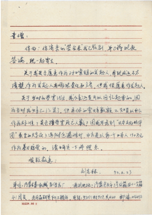 细节:童增先生寄来的签名表我已经收到,现已经签上支持者的名字。我自愿作为对日索赔的发起人,支持索赔。